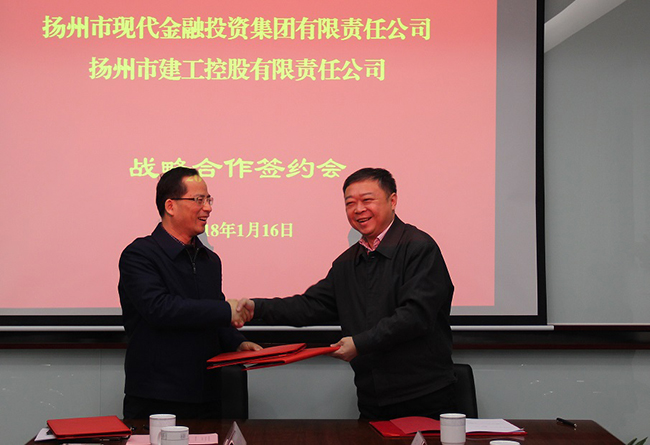 1月16日下午,揚(yáng)州建工控股有限責(zé)任公司與揚(yáng)州市現(xiàn)代金融投資集團(tuán)有限責(zé)任公司(下稱“金融集團(tuán)”)舉行戰(zhàn)略合作簽約會(huì)。公司董事長(zhǎng)王宏、副總經(jīng)理程杰,金融集團(tuán)董事長(zhǎng)龔振志、總經(jīng)理劉研等出席簽約會(huì)。